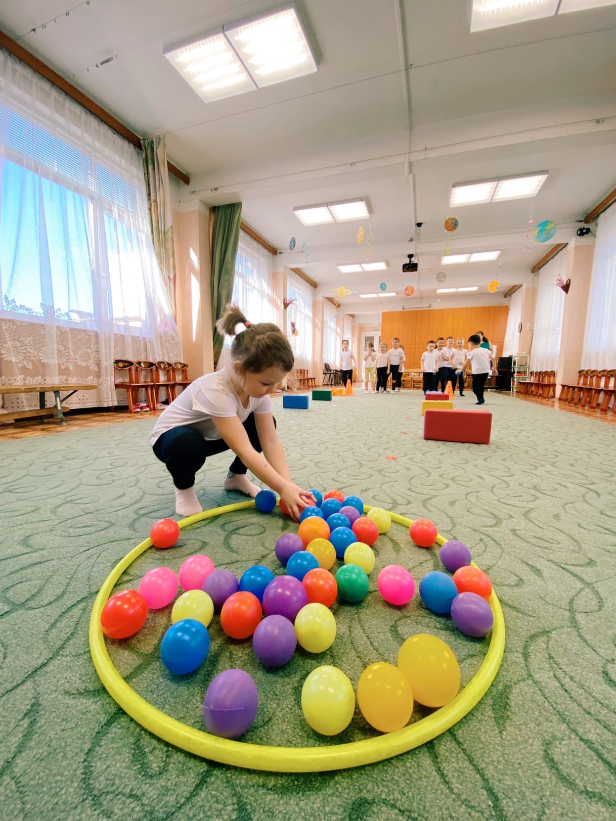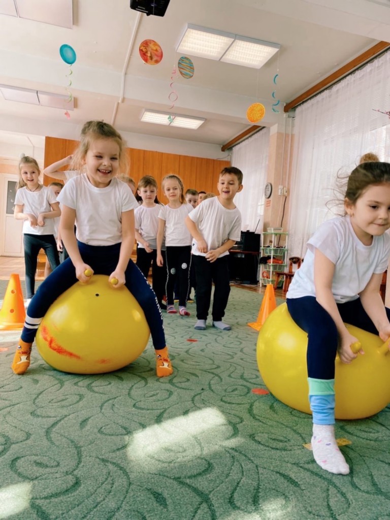 Дети передвигаются на «венероболах» на досуге ко Дню космонавтики