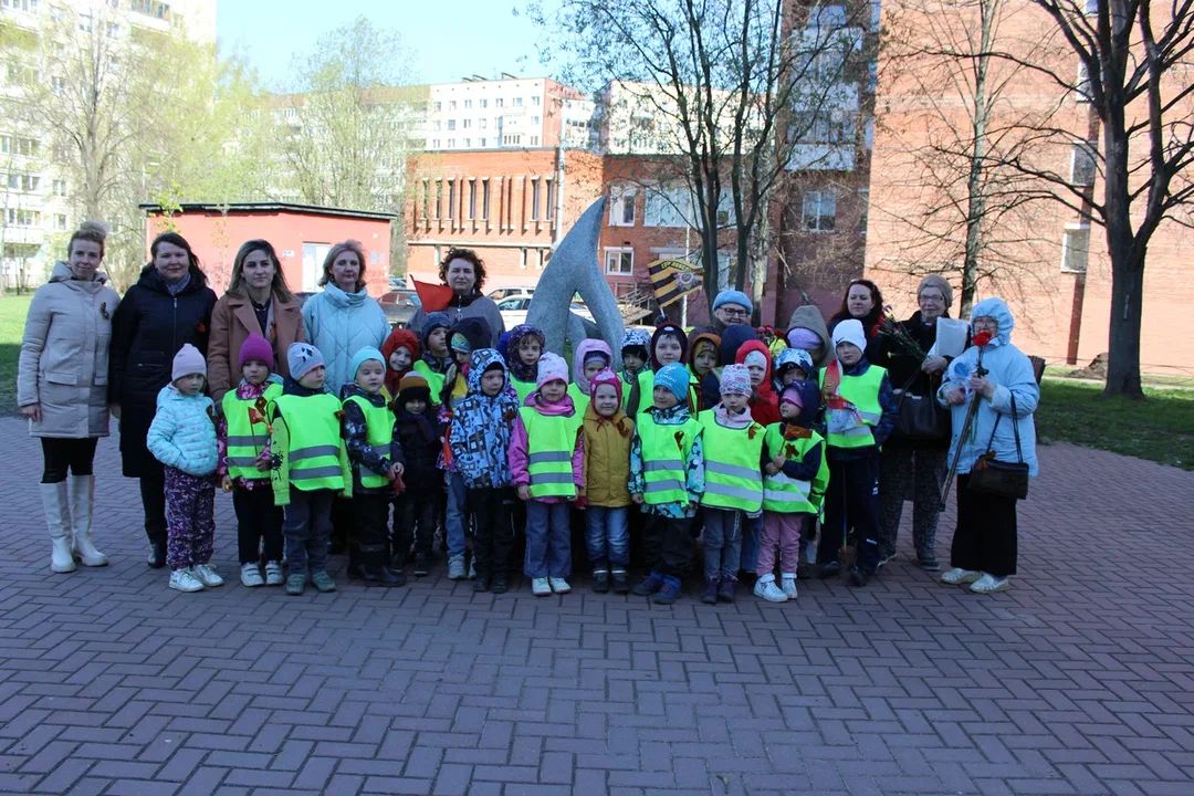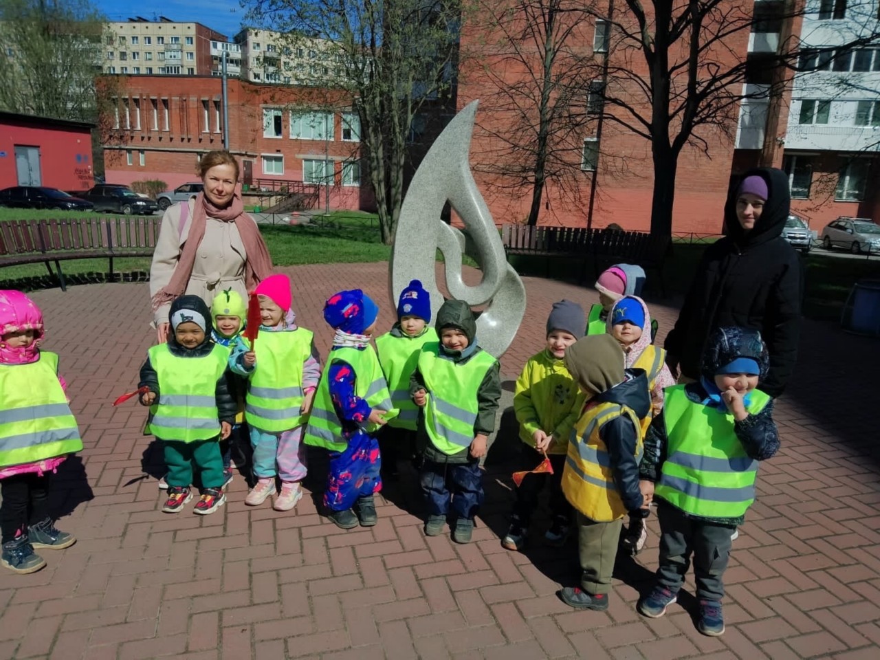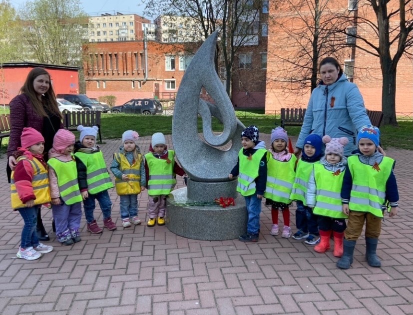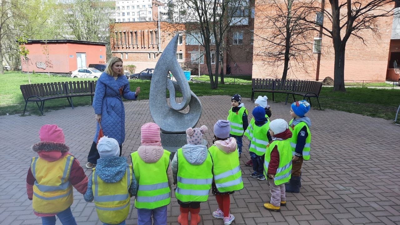 2 и 3 мая 2023 года для воспитанников разных групп были организованы образовательные путешествия к символическому вечному огню, скульптуре, расположенной в благоустроенном дворовом пространстве.