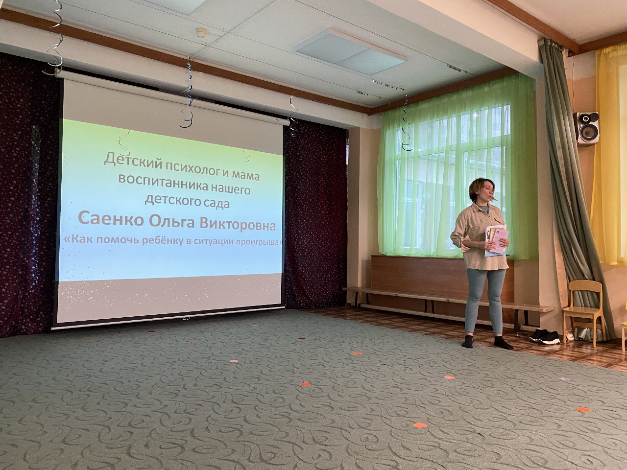 Спикером встречи была детский психолог и по совместительству мама нашего воспитанника Саенко Ольга Викторовна. Она подготовила и поделилась с родителями приемами помощи ребенку в ситуации проигрыша. В нашем семейном клубе звучали приёмы сказкотерапии, арт-терапии, родителям были предложены названия книг и мультфильмов, а так же различные ролевые игры.